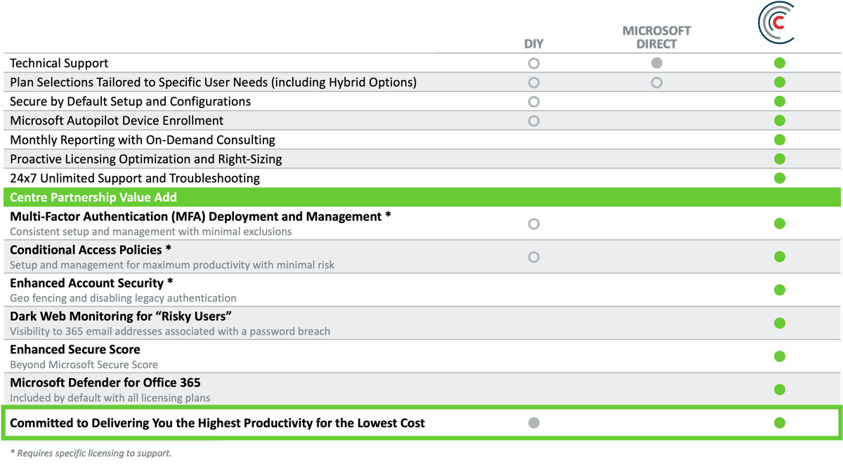 However, partnering with a Microsoft Solutions Partner like Centre Technologies provides enhanced, personalized support and proactive management.